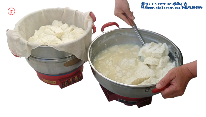 步驟12: 激烈攪拌煮開(kāi)的豆?jié){,與此同時(shí)把石膏漿倒入豆?jié){中,此時(shí)豆?jié){的溫度大約在96℃左右。(溫馨提示:豆?jié){溫度越高,所用的食品級(jí)點(diǎn)石膏粉的數(shù)量越少,反之則食品級(jí)點(diǎn)石膏粉用量越多。如果豆?jié){溫度降到85℃時(shí),食品級(jí)點(diǎn)豆腐石膏粉的用量要增加到每100克干黃豆,4克食品級(jí)點(diǎn)豆腐石膏粉。)